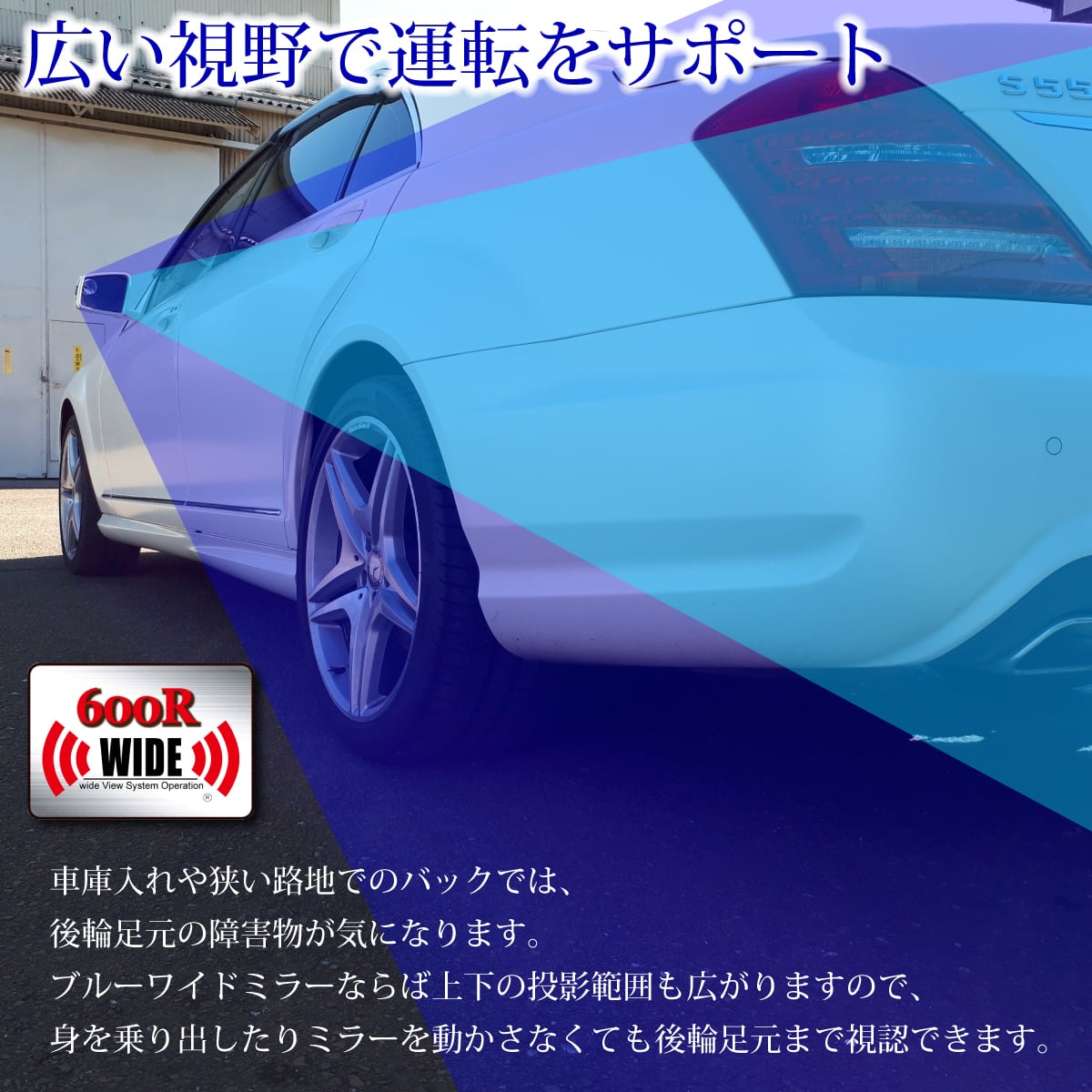 後続車のヘッドライトの眩しさを軽減しつつも良好な視認性を確保するブルー、車検適合で最大限にワイドな後方視界を確保する600Rの曲率。