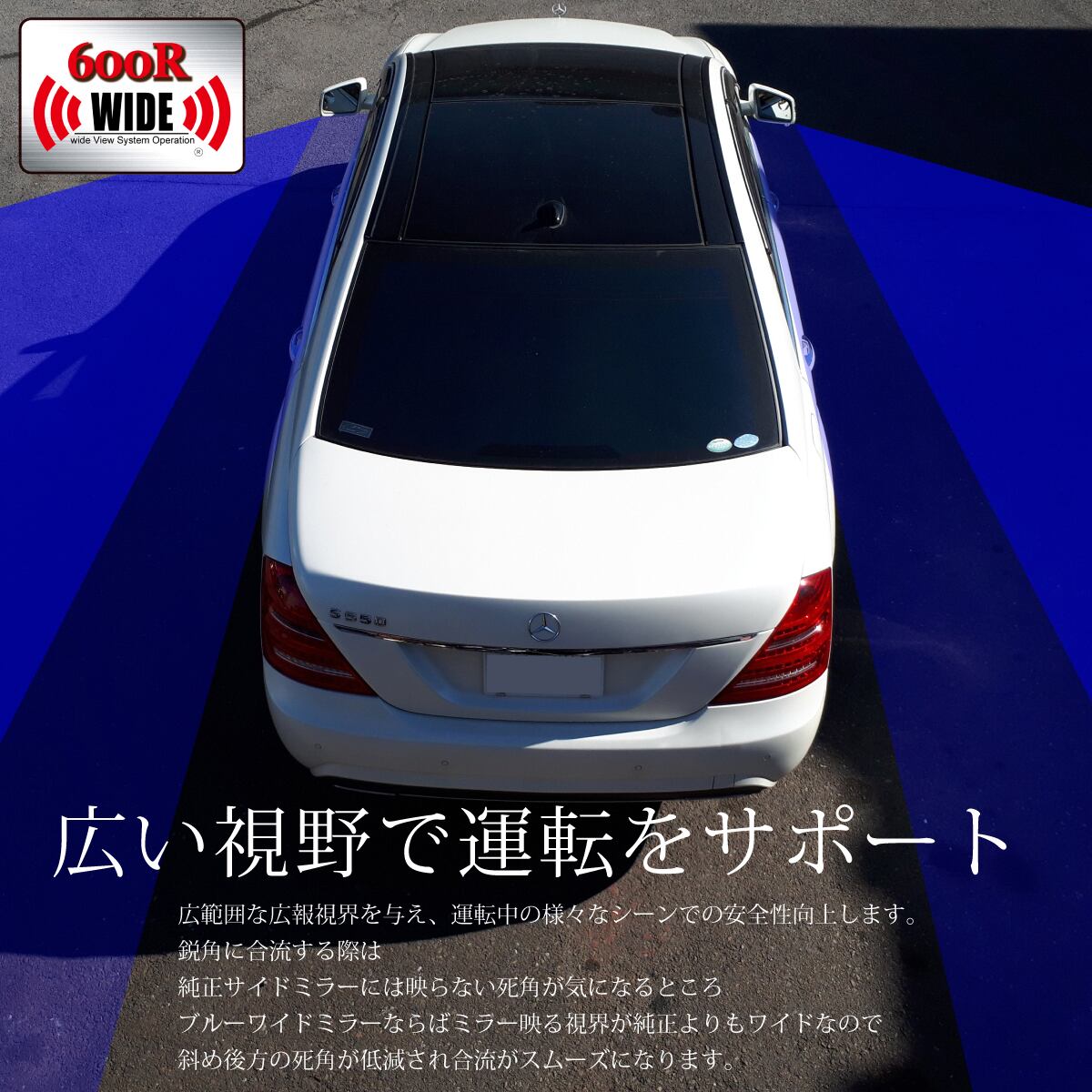 後続車のヘッドライトの眩しさを軽減しつつも良好な視認性を確保するブルー、車検適合で最大限にワイドな後方視界を確保する600Rの曲率。
